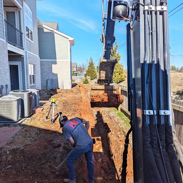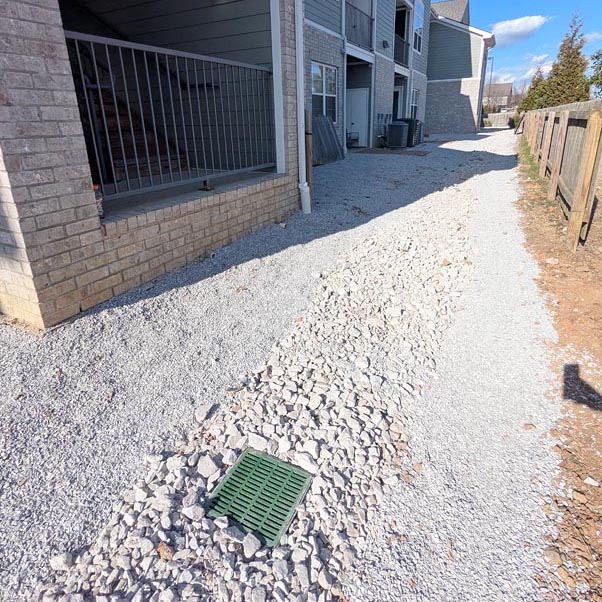 When previous attempts to solve a flooding issue failed, Property Renovation Services was called in to provide a lasting solution. The apartment complex had continued to experience water intrusion after another contractor installed a cheap channel drain system that simply couldn’t handle the volume of runoff (see the first photo). Our team assessed the site and designed a proper drainage plan that addressed both surface and subsurface water flow.