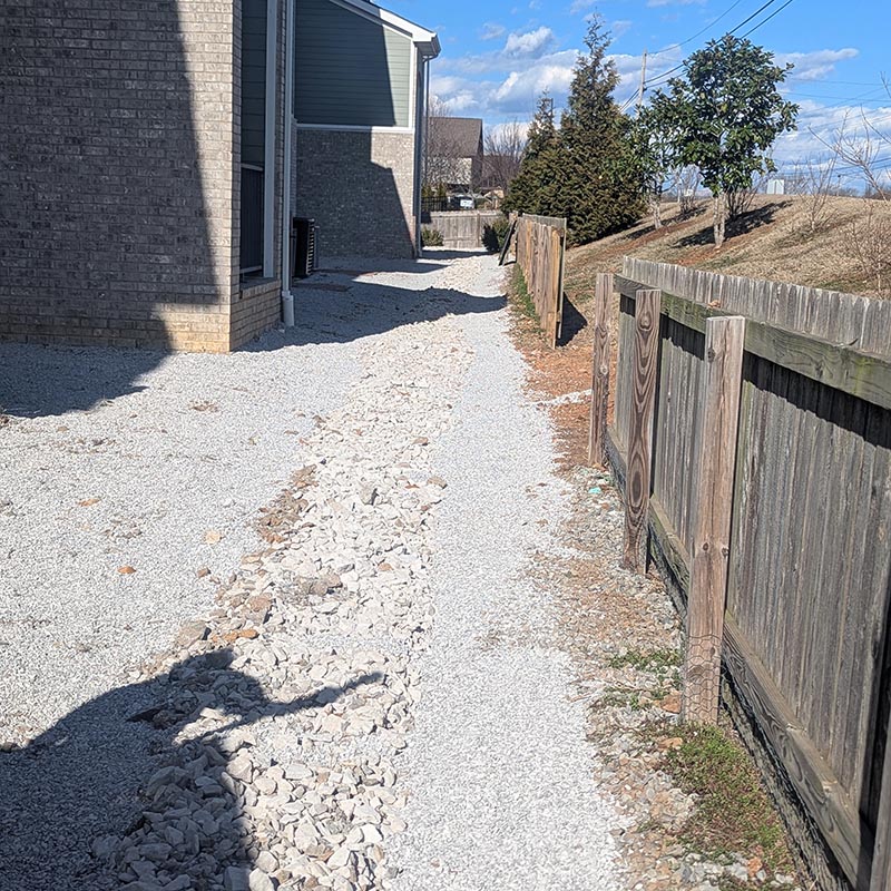 We removed the ineffective drain and installed three 6-inch pipes—one dedicated to roof downspouts, another to box drains, and a third to French drains designed to capture water running off the hillside. The system was engineered to move water efficiently away from the buildings and foundation. After several heavy rains since the installation, the property has remained completely dry—proof that a well-planned drainage system makes all the difference in long-term performance.