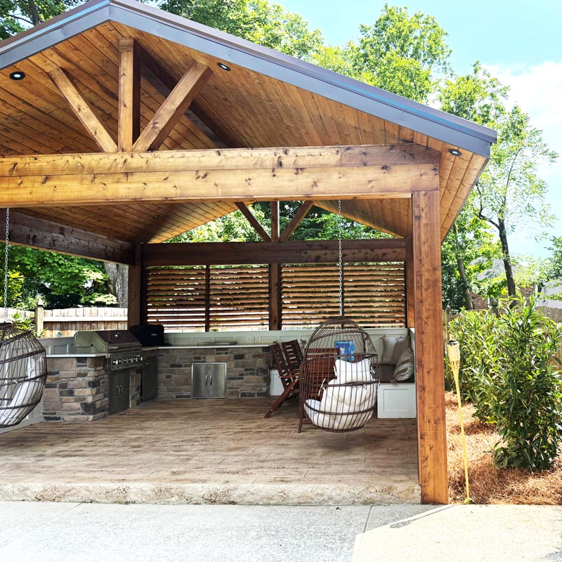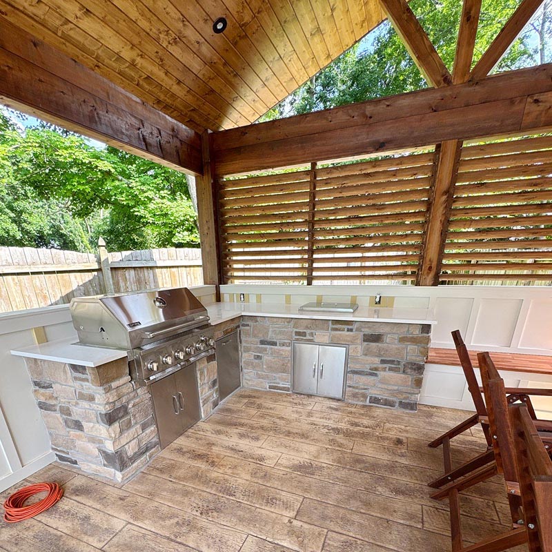The gazebo was constructed with durable western cedar posts and finished with tongue-and-groove ceilings, then stained to provide a warm, natural look with long-lasting protection. Underfoot, a stamped concrete slab mimics the look of tile, combining elegance with easy maintenance. By blending sturdy materials with thoughtful design, we delivered a space that not only enhances the backyard’s functionality but also elevates its style. This project highlights how tailored outdoor structures can transform everyday spaces into inviting retreats built to last for years of enjoyment.